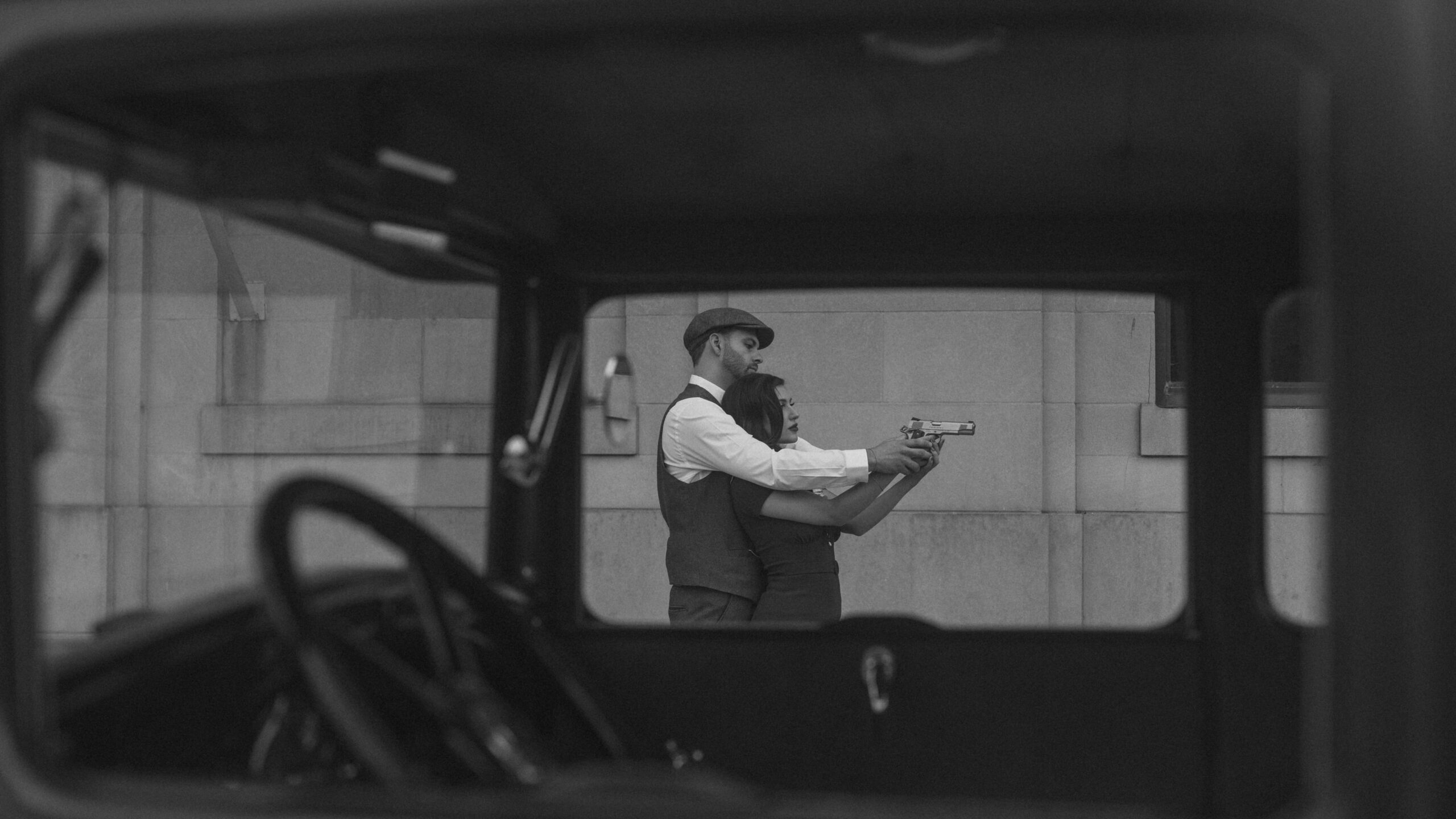 A cinematic Peaky Blinders inspired couples session in Amarillo, Texas featuring vintage styling, a classic car, and storytelling-driven engagement photography.